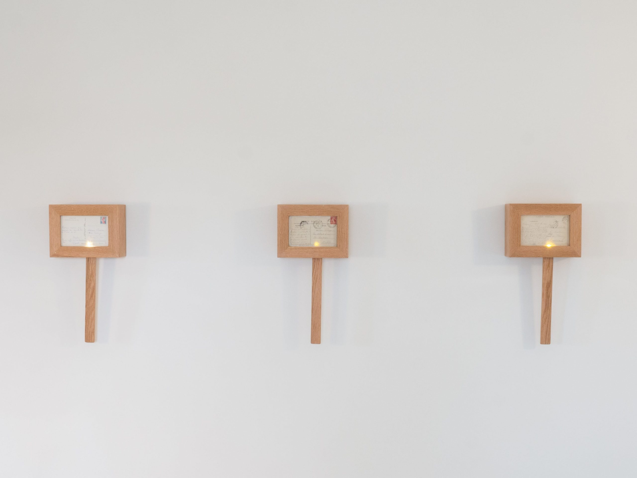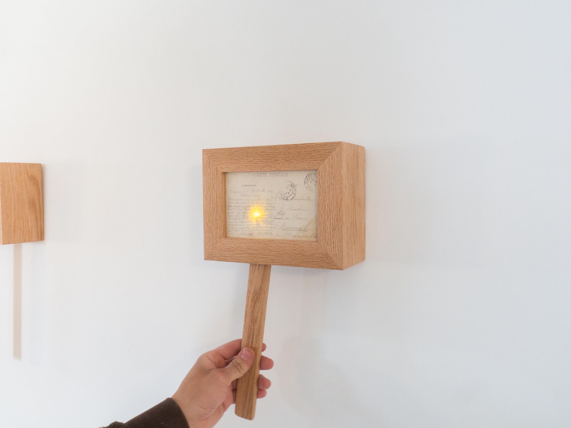 Cartes postales anciennes et boîtes lumineuses interactives en chêne